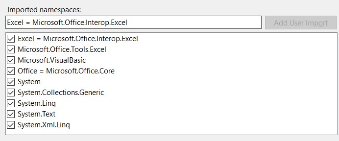 using Excel = Microsoft.Office.Interop.Excel;Vb.Net'te Imports kısmında aynısını yapabileceğiniz gibi, MyProject>References içinde aşağıdaki gibi ekleyerek de bunu yapabilirsiniz.