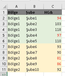 Şimdi diyelim ki şöyle bir listemiz var. Burada bölgenin ortalama HG% oranından düşük HG%'li şubeleri renklendirmek istiyoruz ama şubenin HG%si %100'ün üzerinde kalıyorsa renklenmesin. Mesela Bölge1'in HG% ortalaması %104 olup Şube2'nin renklenmemesi gerekiyor.