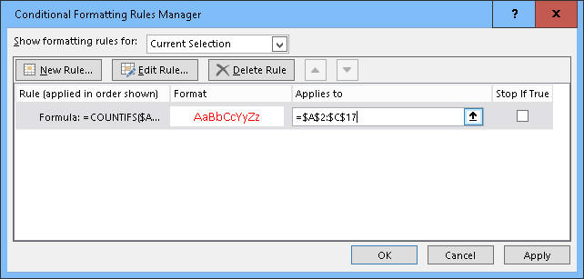 OK dedikten sonra da "Applies to" kutusunu da hangi hücrelere uygulayacaksak onları seçeriz.